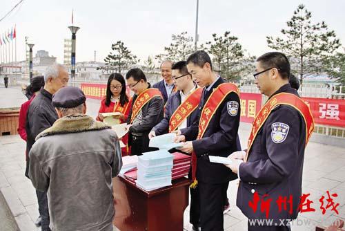 4月15日是全民國家安全教育日,神池縣開展多種形式的宣傳教育活動,在各種公共場所設立宣傳專欄,在縣人民廣場進行安全法宣傳教育。圖為當天上午,縣國家安全領導小組辦公室工作人員走上街頭向過往市民散發(fā)國家安全法宣傳資料。 (楊晉明 詹俊杰 攝)