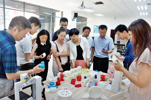 6 月1 日上午,市科技局對我市的兩個眾創(chuàng)空間進行掛牌。目前我市已建成7 家眾創(chuàng)空間,搭建了廣闊的平臺,鼓勵大學生創(chuàng)業(yè)。圖為市科技局和忻府區(qū)科技局的領導以及新聞媒體人員在大學生創(chuàng)業(yè)園區(qū)的眾創(chuàng)空間參觀3D打印。(楊峻峰 攝)
