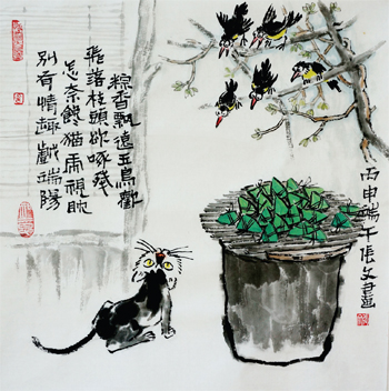 忻州知名節(jié)目主持人“二黃毛”看到這幅漫畫后,詩興大發(fā):“粽香飄遠玉鳥歡,飛落枝頭欲啄殘;怎奈饞貓虎視眈,別有情趣戲端陽?!睆埼挠X得老同學(xué)“二黃毛”的詩詮釋了畫意,于是將四句詩題寫于畫上,詩與畫頓時渾然天成。