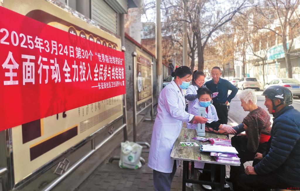 3月24日,是第30個世界防治結(jié)核病日。為進一步動員社會各界廣泛參與,增強公眾健康意識,推動全市結(jié)核病防治工作,市衛(wèi)健委組織開展了世界防治結(jié)核病日系列宣傳活動。圖為忻府區(qū)長征街社區(qū)衛(wèi)生服務中心醫(yī)護人員為群眾測量血壓。 (記者 宮清華攝)