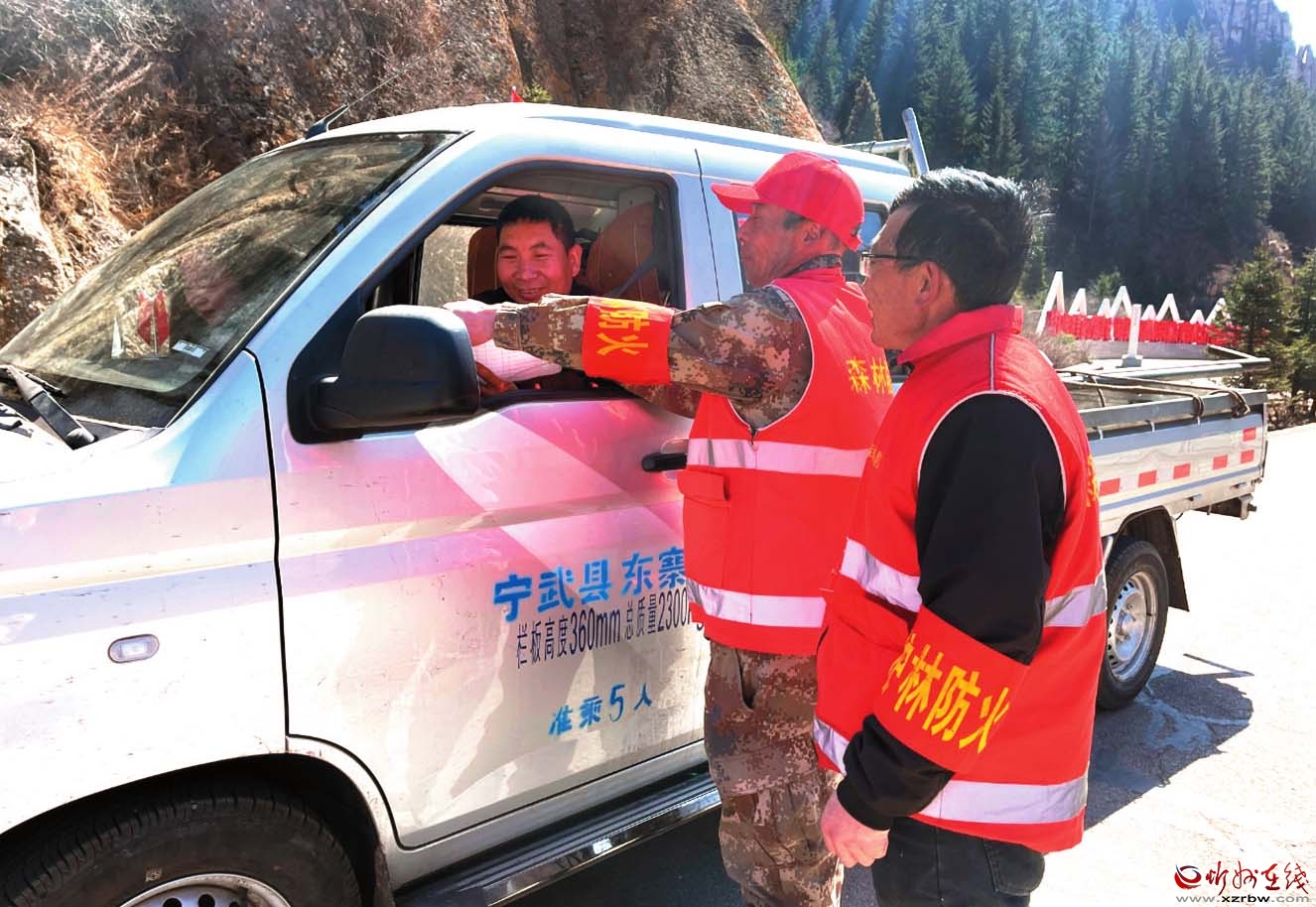 “進山請掃碼登記,先把火種暫存在我這兒!”在寧武縣涔山鄉(xiāng)支鍋石防火檢查卡點,生態(tài)護林員正在對過往車輛及行人進行嚴格登記,從嚴管控火源入山,把好護林防火“第一關”。 (吳光宇 劉 強攝)