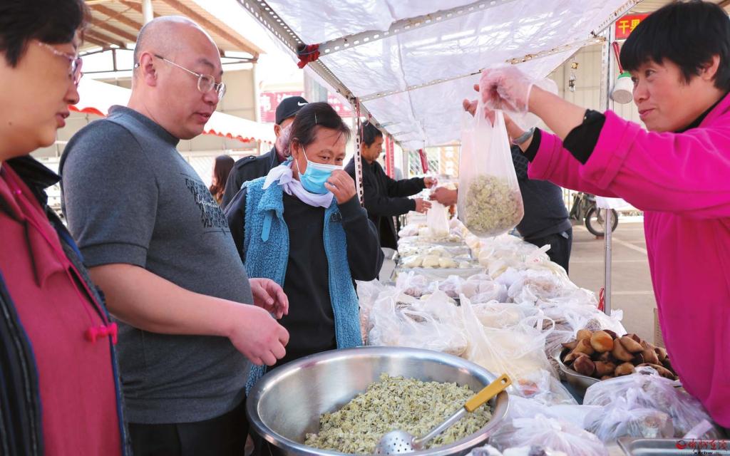 4月7日,市民在忻州城區(qū)光明市場購買蒸榆錢菜。春暖花開時節(jié),田地里的不少野菜都擺上了農(nóng)貿(mào)市場和超市,深受消費(fèi)者喜愛。(記者 宮清華攝)