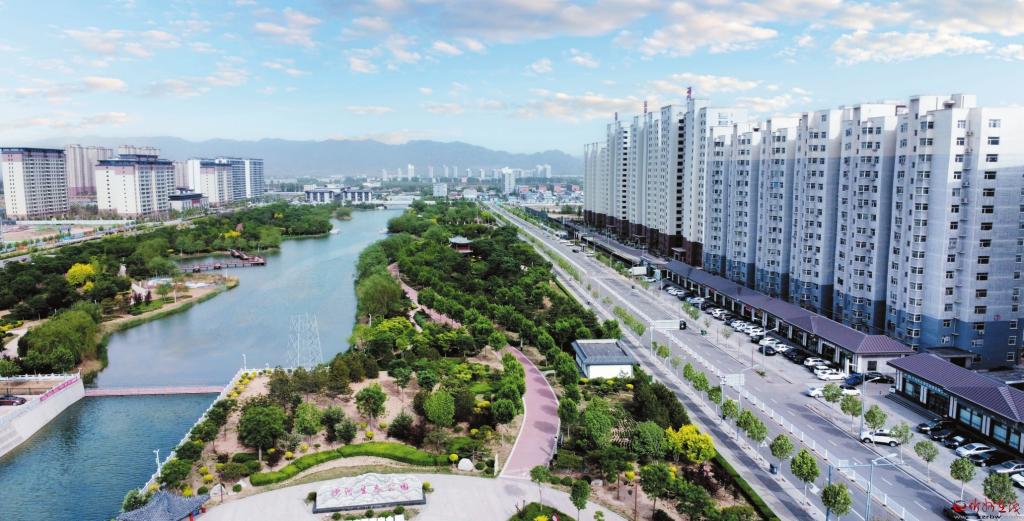 初夏時節(jié),原平城區(qū)沙河生態(tài)公園內(nèi)草木蔥蘢,與藍天白云、城市建筑構(gòu)成一幅水清、岸綠、景美的城市生態(tài)畫卷。圖為沙河生態(tài)公園一角。(褚震 攝)