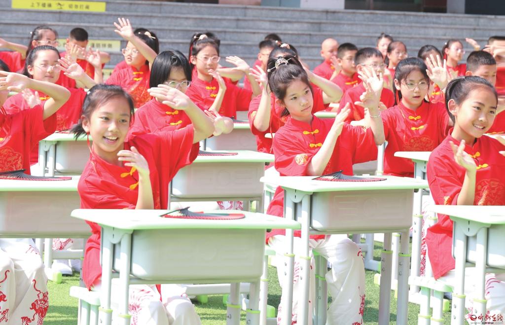 5月28日,市實驗小學(xué)五年級學(xué)生正在排練課桌舞《少年正當(dāng)時》?!傲弧睂⒅粒沂懈饔變簣@、小學(xué)校紛紛組織開展各種活動,迎接國際兒童節(jié)。 (記者 宮清華攝)