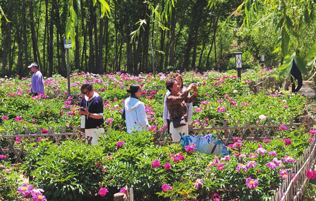 6月3日,原平市大龍門牡丹芍藥山莊天藍云白,山清水秀,魚躍蛙鳴,牡丹花、芍藥花競相綻放,成為八方賓客暢游之地。圖為游客正在盡情欣賞牡丹花、芍藥花之美。褚震攝