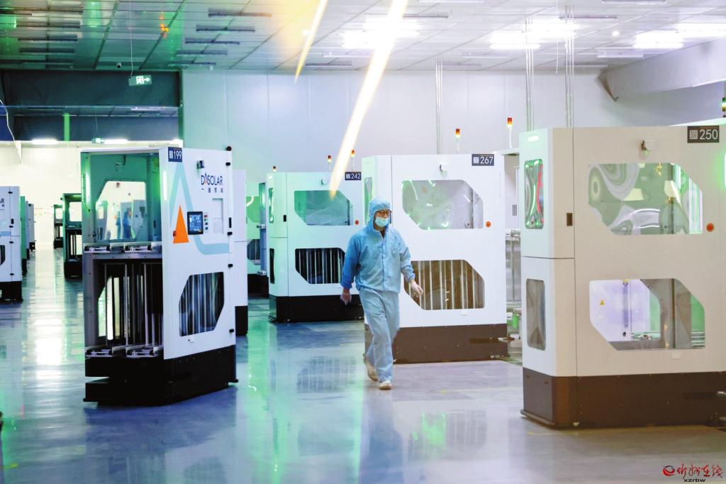 坐落于忻州經(jīng)濟(jì)開(kāi)發(fā)區(qū)的一道新能源科技(忻州)有限公司是一家主要從事高效光伏電池及組件的研發(fā)、制造與銷(xiāo)售,同步覆蓋太陽(yáng)能發(fā)電技術(shù)服務(wù)、電池制造及太陽(yáng)能熱利用產(chǎn)品的企業(yè)。該公司構(gòu)建起的“黑燈工廠”級(jí)智能化生產(chǎn)線展現(xiàn)出強(qiáng)大的生產(chǎn)能力和高效的運(yùn)營(yíng)水平,自主研發(fā)的TOPCon4.0光伏電池量產(chǎn)效率已達(dá)26.7%,處于行業(yè)領(lǐng)先。圖為一道新能源智能化生產(chǎn)車(chē)間。 (記者 張存良攝)