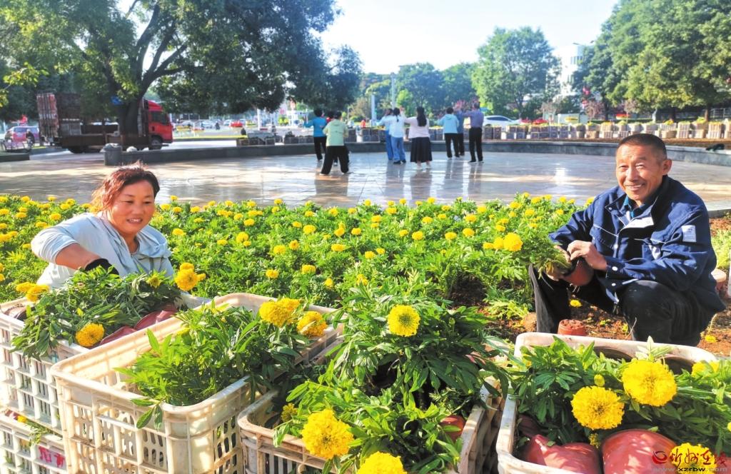 9月9日,山西云中園林工程有限公司人員在忻州城區(qū)日月廣場(chǎng)更換萬壽菊,讓“日月同輝”主題花壇為城區(qū)添彩,喜迎國(guó)慶。 (本報(bào)記者 宮清華攝)