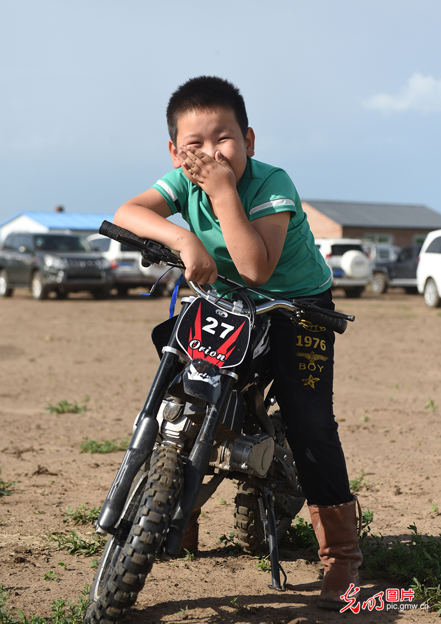 其日麥拉圖的大孫子時(shí)常會(huì)來(lái)爺爺家。對(duì)他而言,胯下的兒童玩具車就是他的“駿馬”,爺爺家的牧場(chǎng)就是他的后花園。圖為2020年8月2日,其日麥拉圖的孫子在牧場(chǎng)玩耍。(潘迪攝/光明圖片)