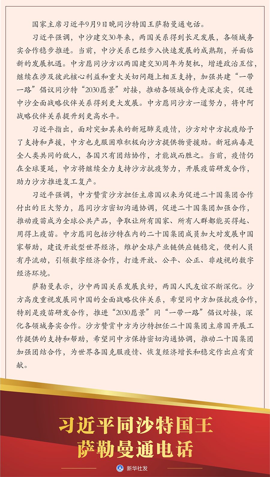 新華社北京9月9日電 國家主席習(xí)近平9月9日晚同沙特國王薩勒曼通電話。