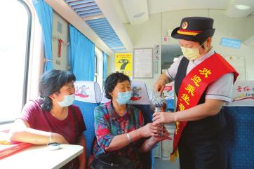 乘務員在蔡家崖號列車上為旅客提供服務。