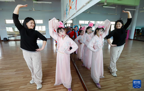 3月25日,河北省遵化市第四實驗小學(xué)戲劇社團的學(xué)生在老師的指導(dǎo)下練習(xí)戲劇表演基本功。(新華社發(fā) 劉滿倉 攝)