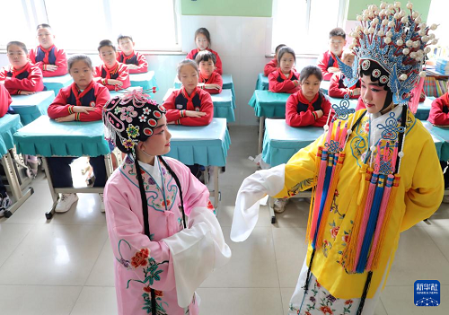 3月25日,在河北省唐山市豐潤區(qū)泉河頭鎮(zhèn)團山子小學(xué),評劇演員在教學(xué)生戲曲動作。(新華社發(fā) 朱大勇 攝)