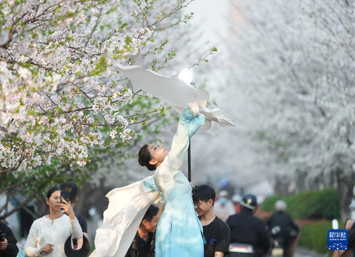 3月26日,人們?cè)跈鸦ㄅ艿琅懿?、騎行。(新華社記者 翁忻旸 攝)