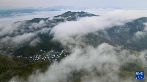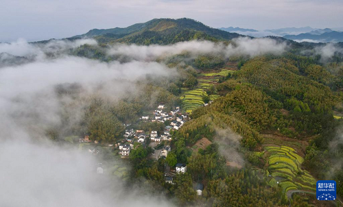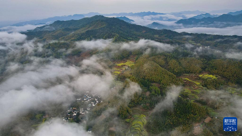 雨后初霽,位于安徽省黃山市徽州區(qū)呈坎鎮(zhèn)的靈山村出現(xiàn)云海景觀,縹緲的云霧與徽派民居、梯田花海相映成趣,美不勝收。