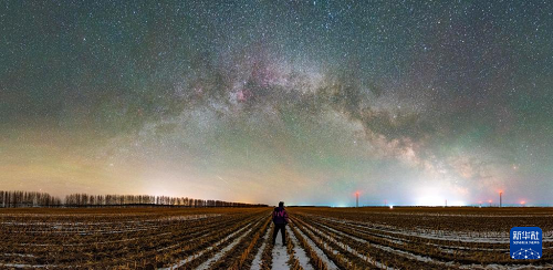 3月30日凌晨在黑龍江省齊齊哈爾市一風電場拍攝的“銀河拱橋”(拼接照片)。(新華社發(fā) 王勇剛 攝)