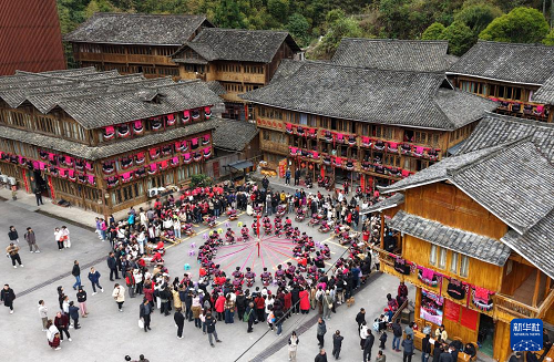 3月31日,當(dāng)?shù)厝罕娫趶V西三江侗族自治縣古宜鎮(zhèn)表演民族歌舞(無人機(jī)照片)。(新華社發(fā) 吳練勛 攝)