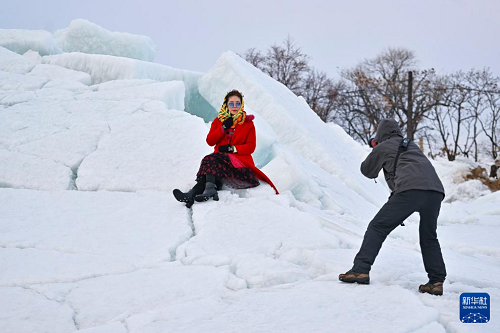 3月31日,游客在興凱湖畔的冰層上游玩。(新華社記者 謝劍飛 攝)