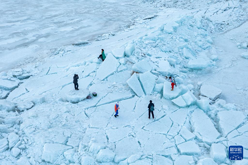 3月31日,游客在興凱湖畔的冰層上游玩(無(wú)人機(jī)照片)。(新華社記者 謝劍飛 攝)
