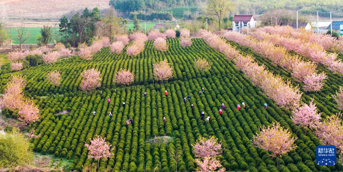 4月2日,在安徽省宣城市郎溪縣建平鎮(zhèn)精忠村的一處茶園,茶農(nóng)們在采摘茶葉(無人機照片)。(新華社發(fā) 李曉紅 攝)