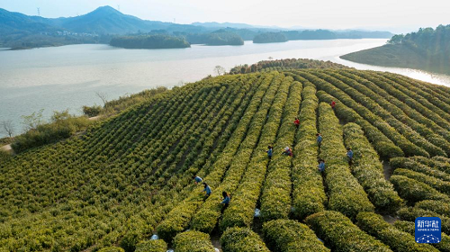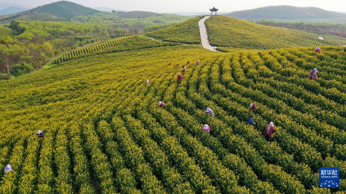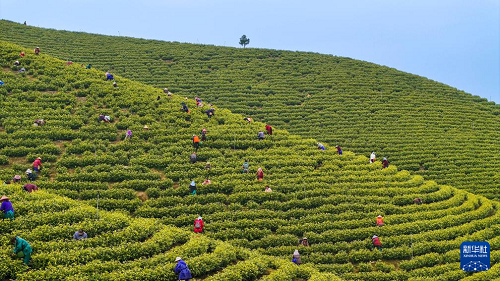 4月1日,在安徽省宣城市郎溪縣姚村鎮(zhèn)的一處茶園,茶農(nóng)們在采摘茶葉(無人機照片)。(新華社發(fā) 李曉紅 攝)