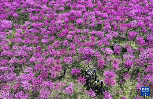 4月7日,游客在湖北省宣恩縣珠山鎮(zhèn)和平社區(qū)賞花游玩(無人機照片)。(新華社發(fā) 宋文 攝)