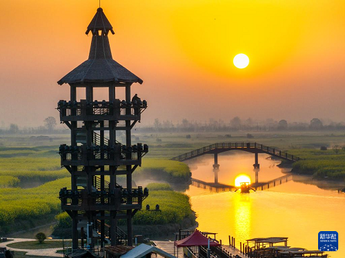 4月8日拍攝的江蘇省興化市千垛景區(qū)日出晨景(無人機照片)。(新華社發(fā) 周社根 攝)