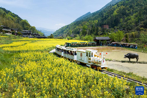 4月8日,游客在湖北省宣恩縣彭家寨吊腳樓前乘坐“小火車”賞花游玩(無人機照片)。(新華社發(fā) 陳緒開 攝)