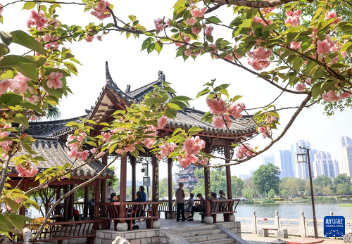 4月8日,游人在湖北省武漢市一公園賞花游覽。(新華社發(fā) 趙軍 攝)