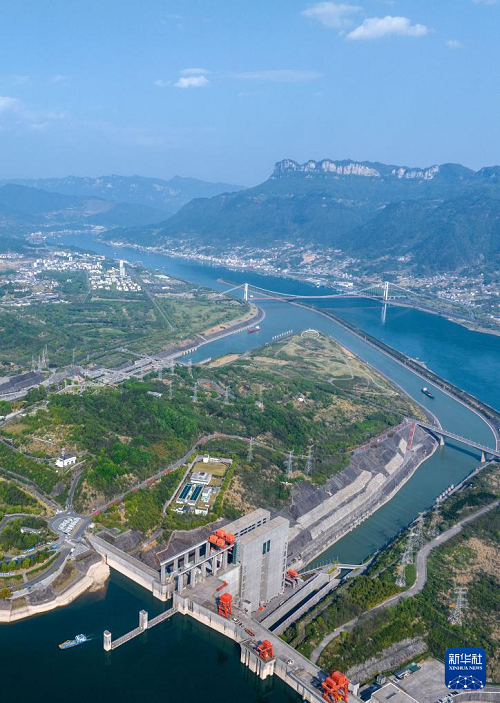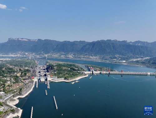4月8日,在湖北省宜昌市,船舶有序通過三峽樞紐(無人機照片)。(新華社發(fā) 王罡 攝)