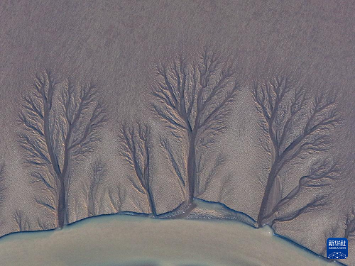 這是2024年10月29日在鹽城市東臺條子泥濕地拍攝的“潮汐樹”(無人機照片)。(新華社記者 李博 攝)