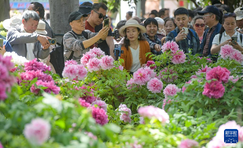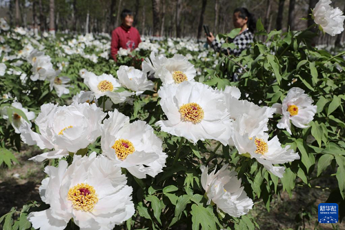 4月13日,游客在河南省焦作市溫縣國有實驗林場芍藥花海中賞花拍照。(新華社發(fā) 徐宏星 攝)