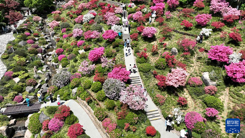 4月13日,游客在浙江省湖州市德清縣下渚湖奇幻谷杜鵑花海中漫步游玩(無人機(jī)照片)。(新華社發(fā) 謝尚國 攝)