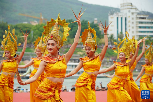 4月13日,在西雙版納傣族自治州景洪市,演員在傣歷新年節(jié)(2025年潑水節(jié))慶祝大會上表演。(新華社記者 高詠薇 攝)