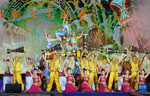 4月12日,在西雙版納傣族自治州景洪市,演員在傣歷新年節(jié)(2025年潑水節(jié))文藝晚會上表演。(新華社記者 高詠薇 攝)