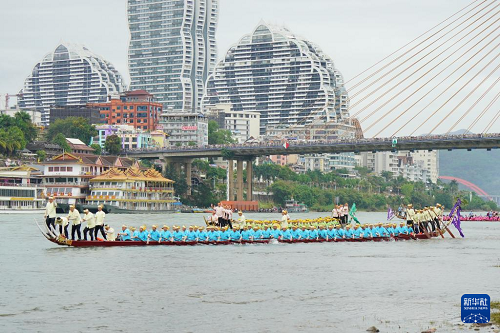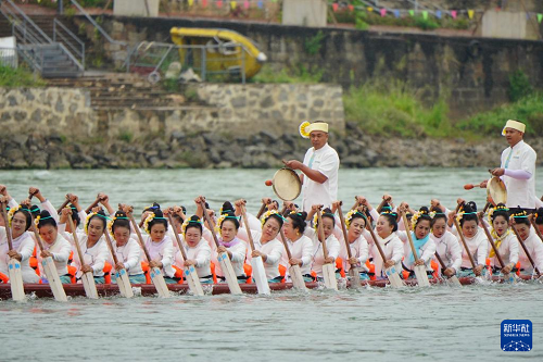 4月13日,在西雙版納傣族自治州景洪市,人們參與傳統(tǒng)龍舟表演賽。(新華社記者 高詠薇 攝)