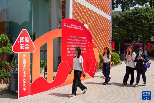 4月14日,參觀者經(jīng)過廣東省國家安全教育館外的宣傳展板。(新華社記者 肖恩楠 攝)