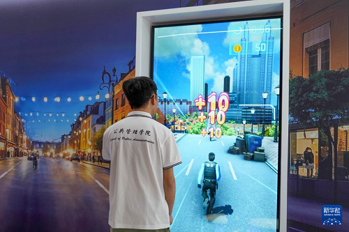 4月14日,參觀者在廣東省國家安全教育館體驗展示項目。(新華社記者 肖恩楠 攝)