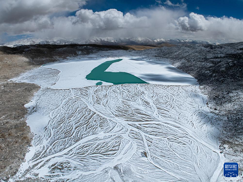 空中俯瞰普拉喜瓊峰腳下的曲隆嘎木措冰川湖(4月13日攝,無人機(jī)照片)。(新華社發(fā) 董志雄 攝)