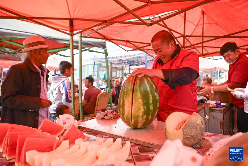 4月13日,一位商販在新疆于田縣先拜巴扎鎮(zhèn)農(nóng)牧民運動場賣水果。(新華社記者 胡虎虎 攝)