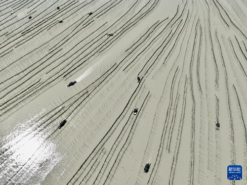 4月15日,福建省霞浦縣沙江鎮(zhèn)海域海帶養(yǎng)殖戶在收獲晾曬后的海帶(無(wú)人機(jī)照片)。(新華社記者 姜克紅 攝)
