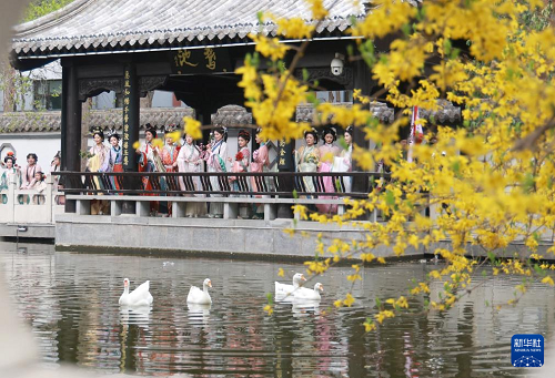 3月29日,在山東省臨沂市王羲之故居,身著傳統(tǒng)服裝的女子參加迎接“三月三”的活動(dòng)。(新華社發(fā) 許傳寶 攝)