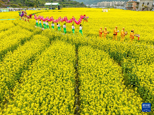 3月31日,農(nóng)歷三月初三,民間藝人在浙江省溫嶺市石橋頭鎮(zhèn)下宅金村表演(無人機(jī)照片)。(新華社發(fā) 徐偉杰 攝)