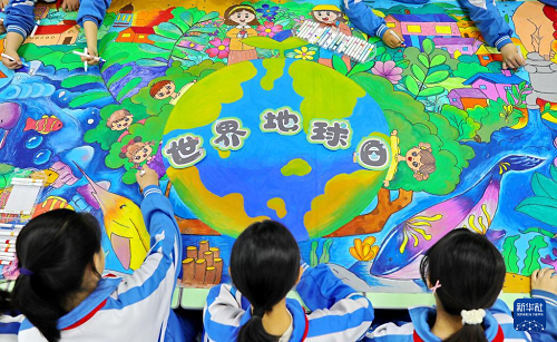 4月21日,河北省秦皇島市海港區(qū)先盛里小學學生在手繪環(huán)保長卷。(新華社發(fā) 曹建雄 攝)