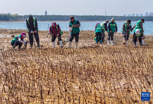 4月21日,在山東省榮成市桑溝灣海域,園林工人在進行蘆葦種植作業(yè)(無人機照片)。(新華社發(fā) 李信君 攝)