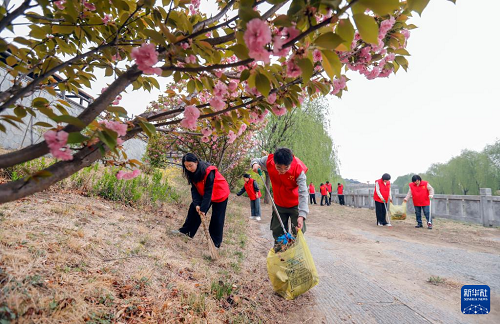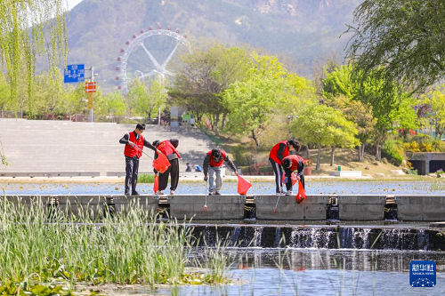 4月21日,河北省遵化市興旺寨鎮(zhèn)志愿者在當?shù)匾惶幘皡^(qū)撿拾雜物。(新華社發(fā) 劉滿倉 攝)