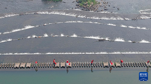 4月21日,浙江省臺州市仙居縣白塔鎮(zhèn)第一幼兒園老師與河長在永安溪巡河護水(無人機照片)。(新華社發(fā) 王華斌 攝)