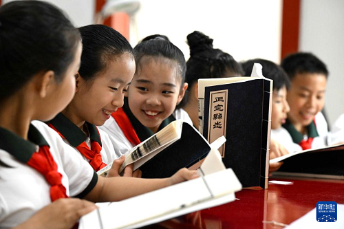 4月21日,石家莊市實驗小學(xué)學(xué)生在石家莊市圖書館古籍修復(fù)室翻閱現(xiàn)代線裝書并交流學(xué)習(xí)體會。(新華社發(fā) 陳其保 攝)