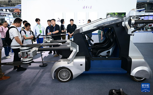 4月26日,觀眾在第三屆中國(安徽)科技創(chuàng)新成果轉(zhuǎn)化交易會(huì)上參觀一款飛行汽車。(新華社記者 周牧 攝)