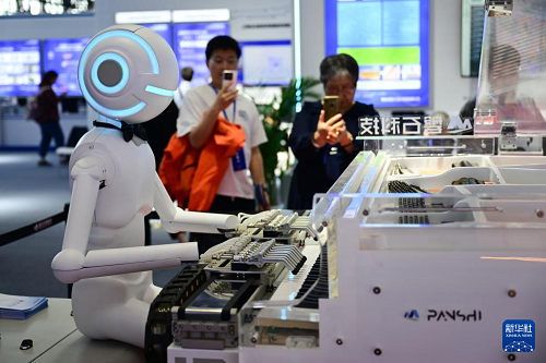 4月26日,觀眾在第三屆中國(安徽)科技創(chuàng)新成果轉(zhuǎn)化交易會(huì)上觀賞一款彈鋼琴的機(jī)器人。(新華社記者 周牧 攝)