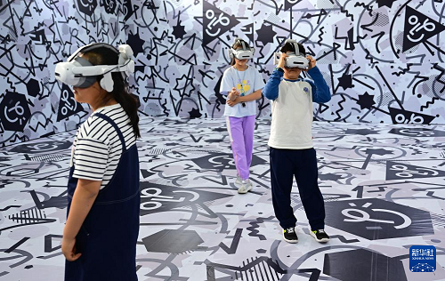 4月26日,小朋友們在第三屆中國(安徽)科技創(chuàng)新成果轉(zhuǎn)化交易會(huì)上體驗(yàn)VR設(shè)備。(新華社記者 周牧 攝)